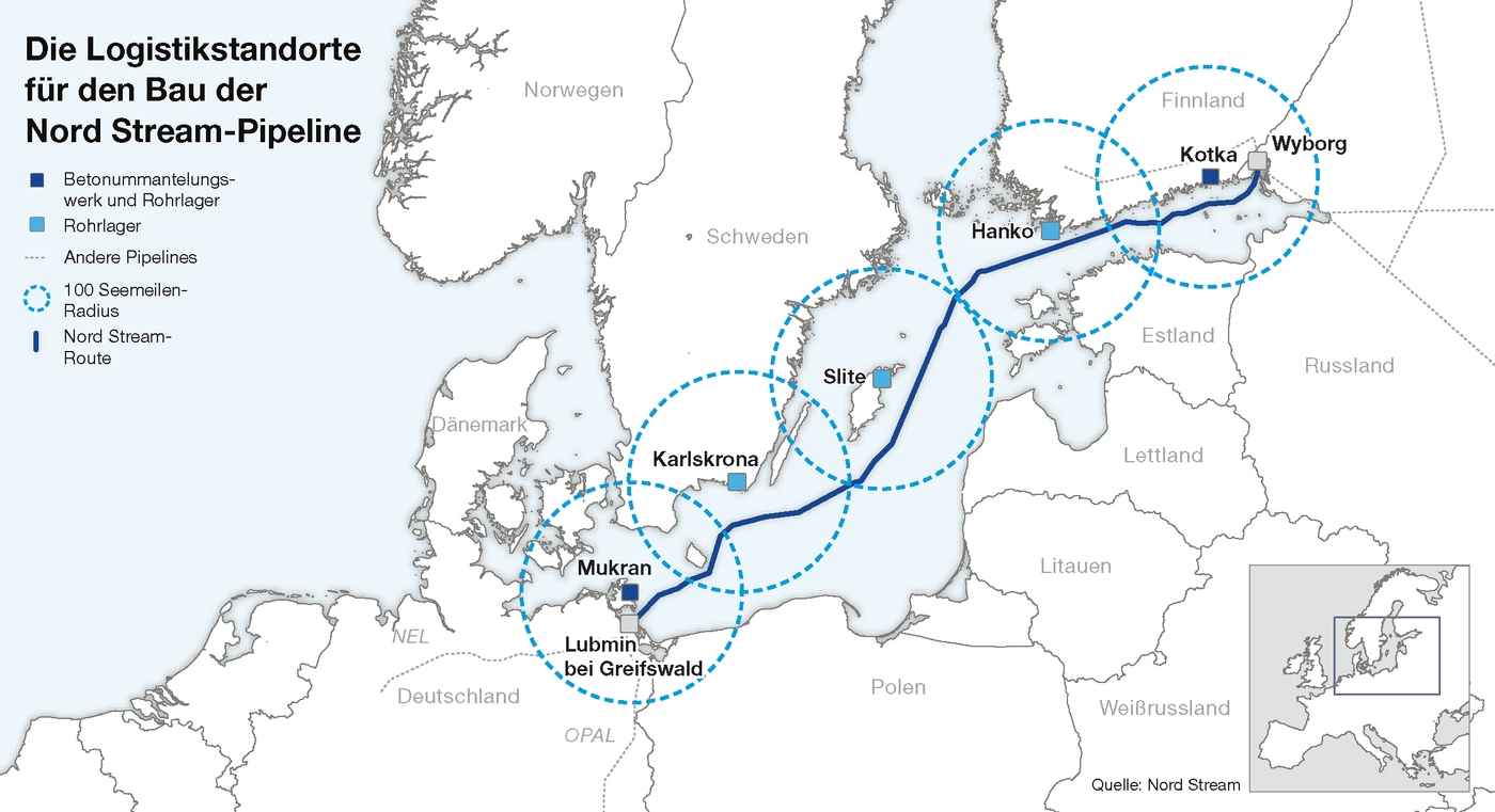 Die Nord Stream-Pipeline, ehemals North European Gas Pipeline (NEGP), ist eine aus zwei Strängen bestehende Ferngasleitung in der Ostsee. Die beiden jeweils 1.224 Kilometer langen Pipelinestränge sind die kürzeste Verbindung zwischen den riesigen Erdgasreserven in Russland und den Energiemärkten in Europa und können bis zu 55 Milliarden Kubikmeter Erdgas pro Jahr transportieren.